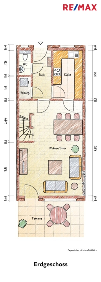 Im Erdgeschoss finden Sie einen geräumigen Wohn-/Essbreich (mit Zugang zur Terrasse/Garten), die Küche, sowie ein Gäste-WC und eine praktische Abstellkammer.