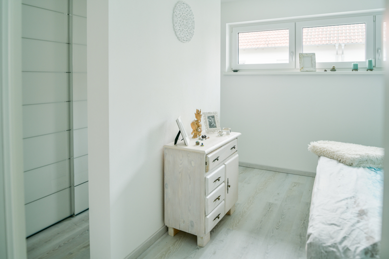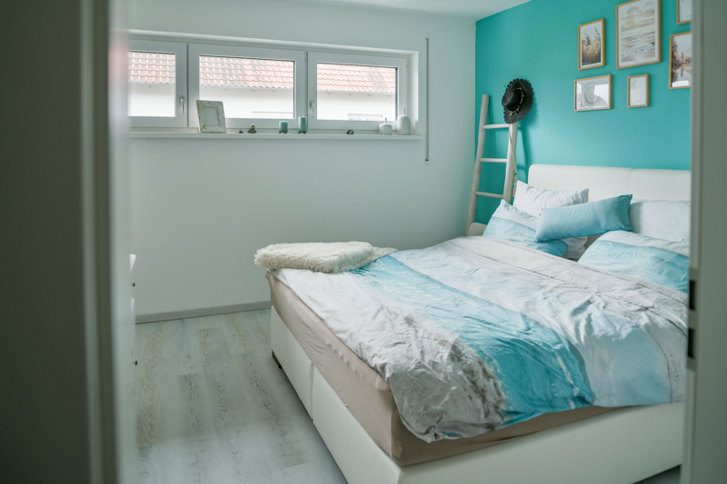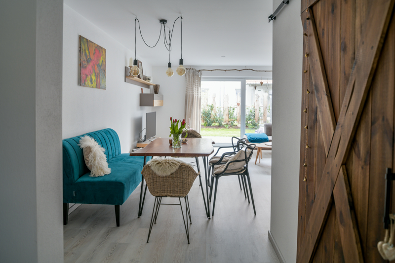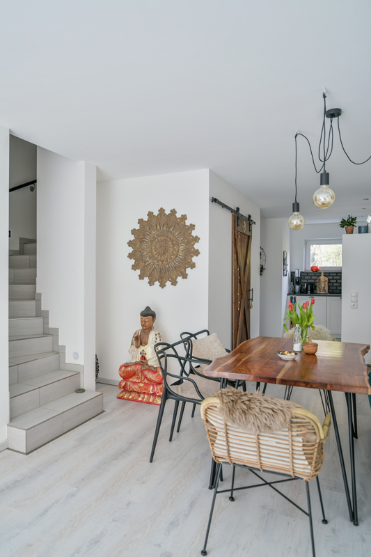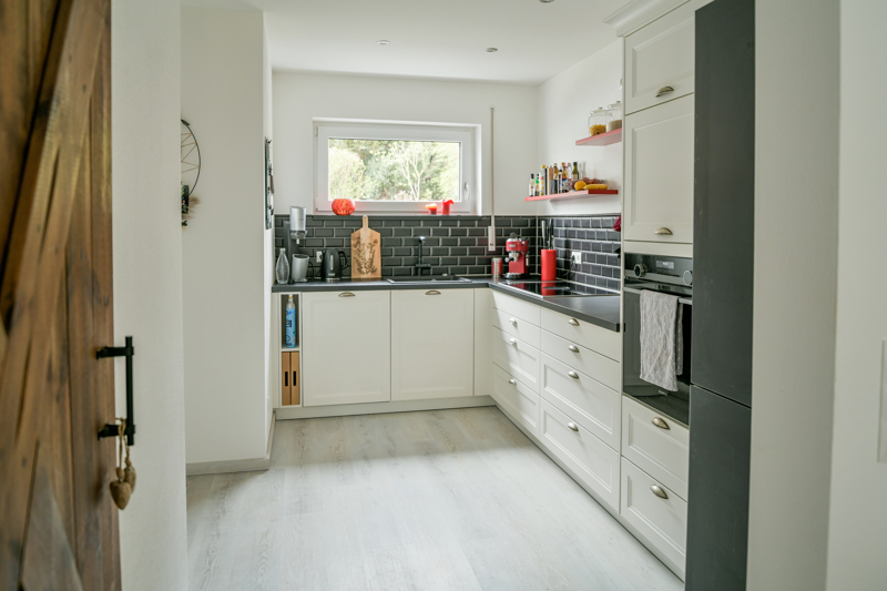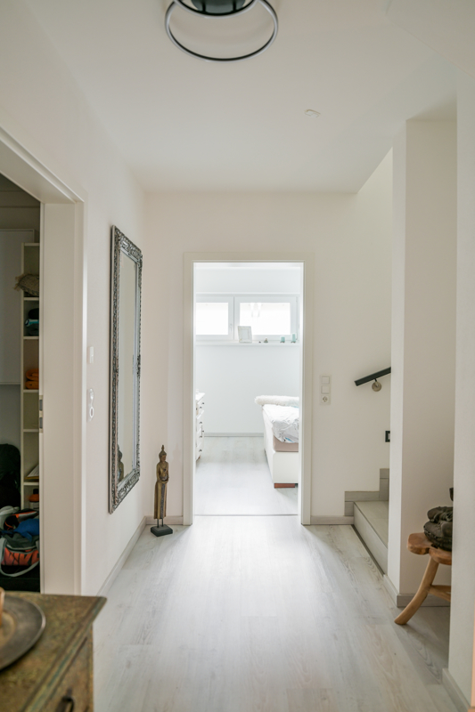 Das Interior ist hell und modern gehalten: warmer Vinylboden im Wohn- und Schlafbereich, Fliesen für Bad, Treppen, Technik- und Abstellräumen.