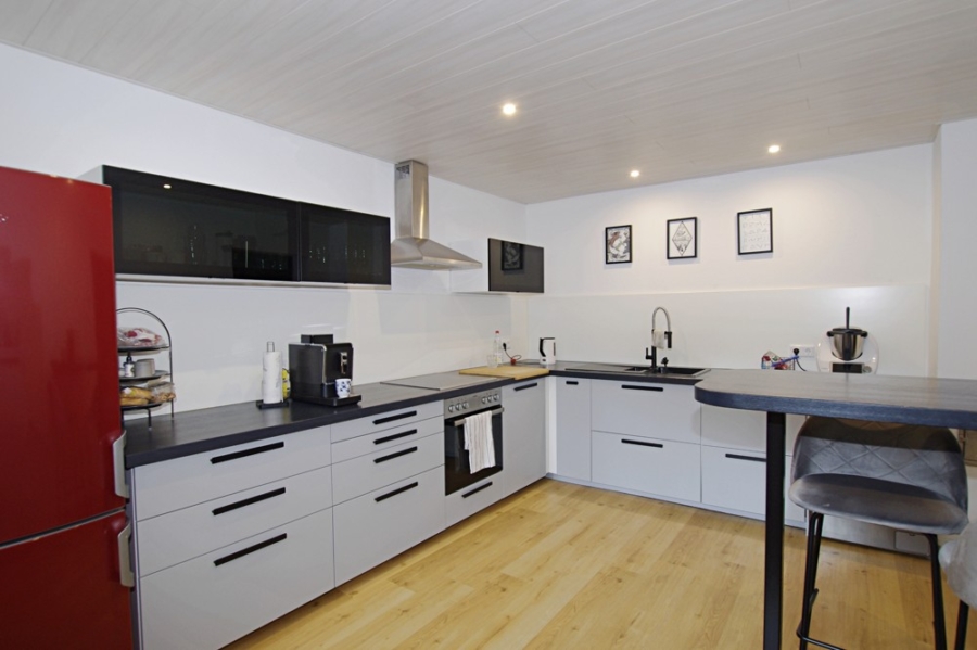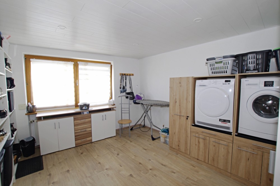 1 Schlaf- bzw. Arbeitszimmer, ein großer Hauswirtschaftsraum mit Waschmaschinenanschluss, ein großräumiges Wohn--Esszimmer mit Pelletofen und einen Wintergarten über die gesamte Hausbreite. Von hier aus gelangen Sie in den wunderschönen, pflegeleichten Garten mit Terrasse, sowie einen überdachten Bereich.