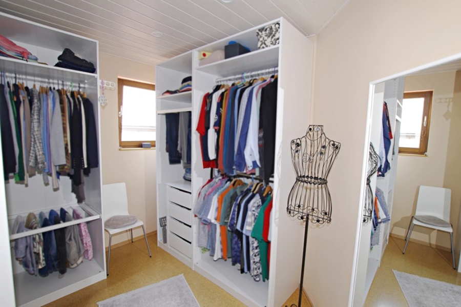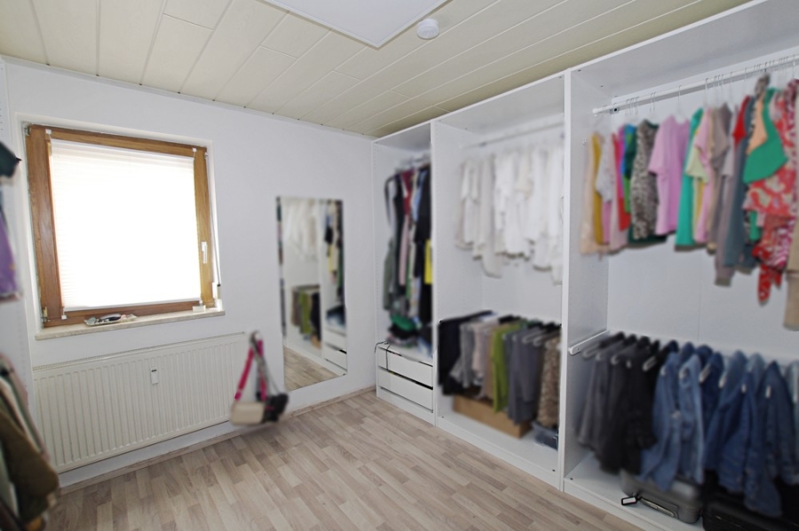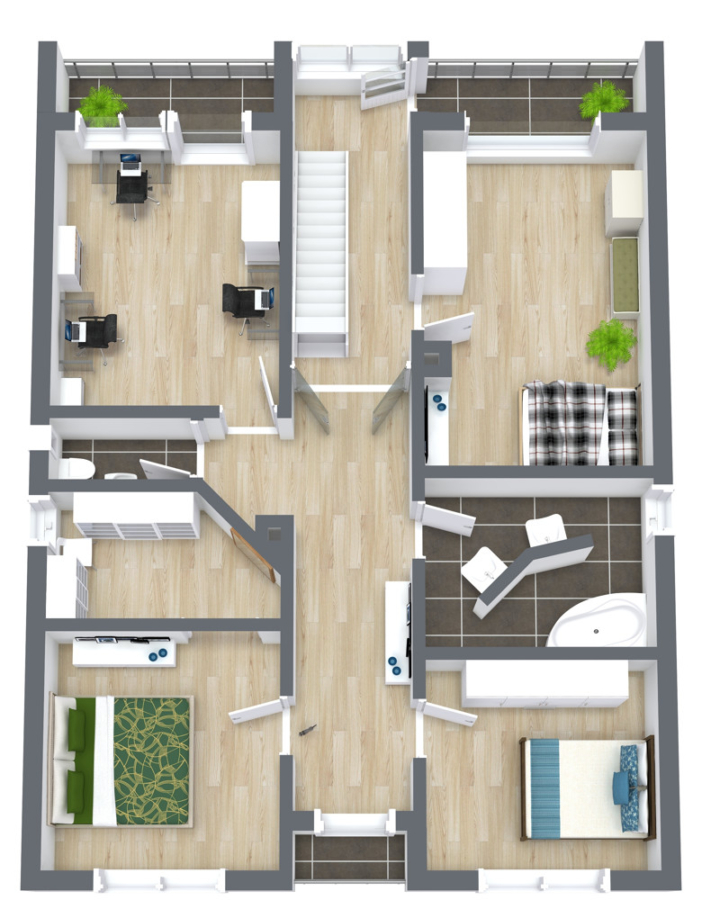 Im 2. OG befinden sich 4 weitere Zimmer (derzeitige Nutzung: 3 Zimmer als Schlafzimmer und eins als Arbeitszimmer – plus ein begehbares Schrankzimmer – ein weiteres Badezimmer mit 2 Waschbecken und Badewanne und ein separates WC.