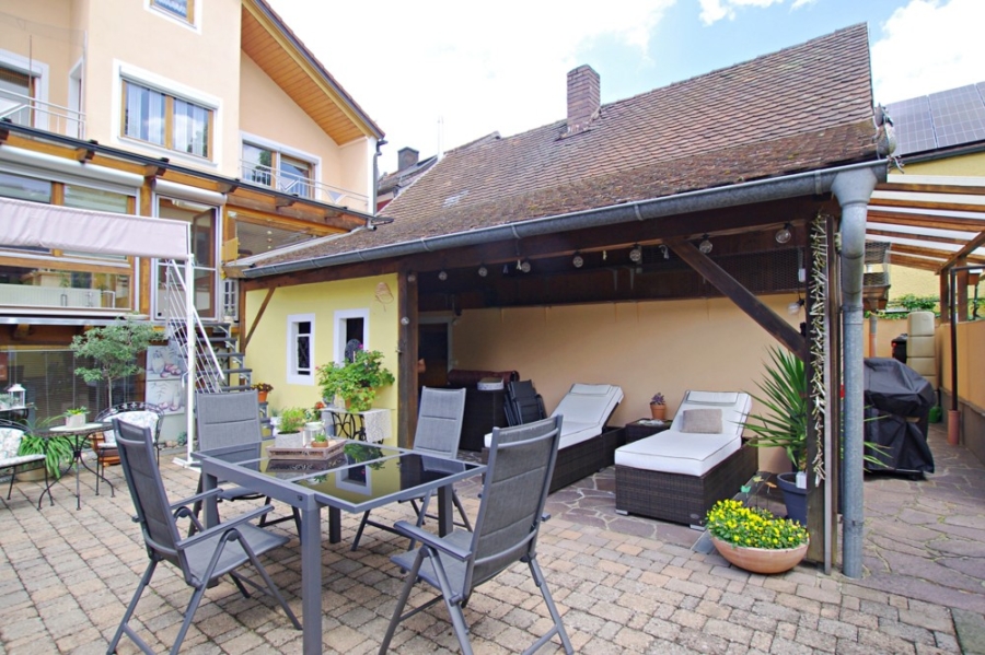 Zudem befindet sich auf dem Grundstück ein Anbau mit einer Überdachung für Ihre Gartenliegen, zum Unterbringen einer Werkstatt und weitere Räumlichkeiten zum Abstellen. Im Untergeschoss des Nebengebäudes sind zudem der Heizungskeller mit einer Pelletheizung und der Pelletlagerraum untergebracht.