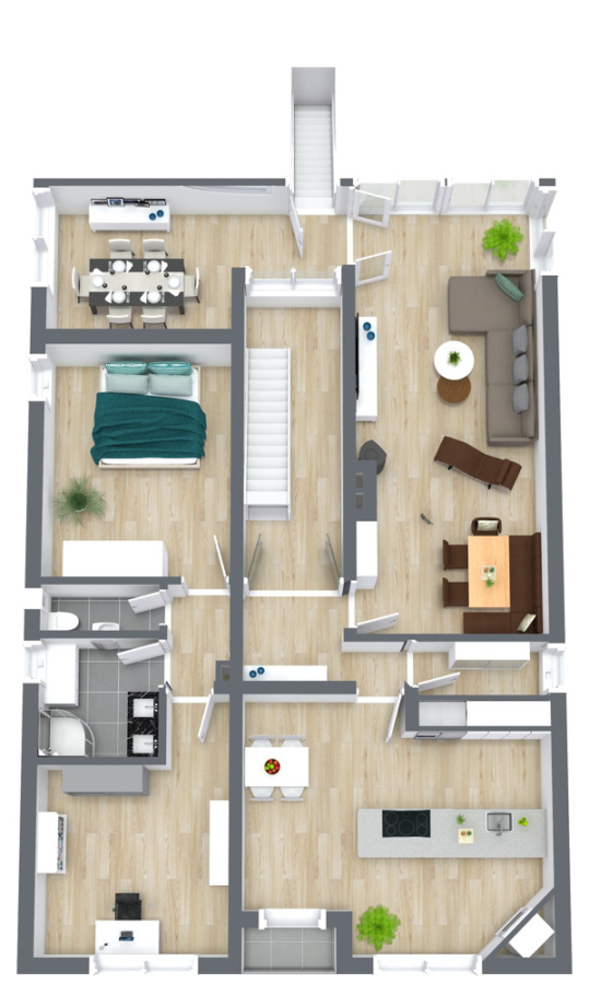 Mit den großzügig dimensionierten Wohnräumen, die in ansprechender und vernünftiger Architektur ausgeführt wurden, bietet es einer großen Familie, sowie einem 1–3 Personen-Haushalt (im EG) ausreichend Platz. Die Aufteilung der einzelnen Ebenen können Sie dem jeweiligen Grundrissplan entnehmen.