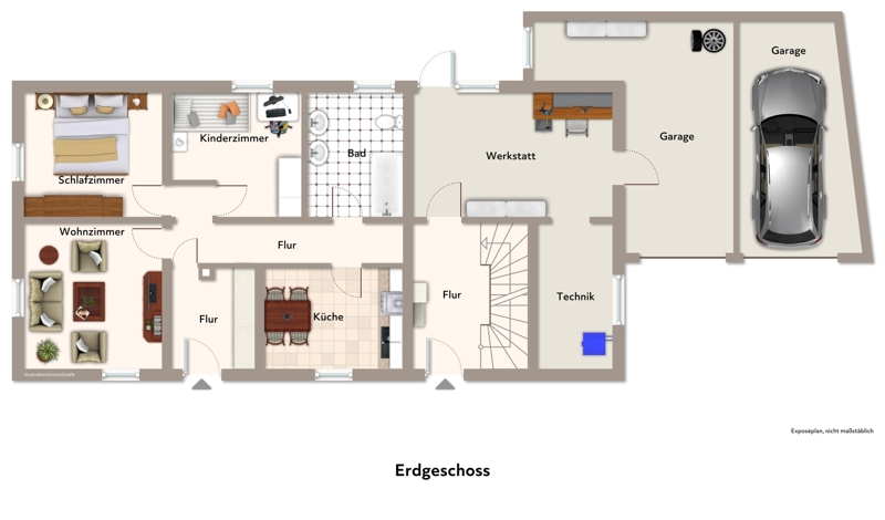 Die Treppe hinuntergehend gelangen Sie über die Diele in die großräumige Werkstatt, die jedes Handwerkerherz höher schlagen lässt und zudem einen Zugang zum Garten bietet.