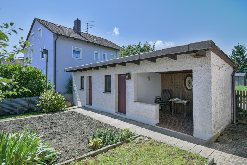 Das Immobilienpaket wird durch den Garten und die großflächige Holzlege, die auch als Werkstatt umfunktioniert werden kann, perfekt abgerundet.