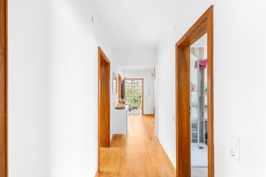 Das Obergeschoss spiegelt in Grundriss und Größe nahezu exakt die untere Wohnung wider – ebenfalls rund 110 m² Wohnfläche, aufgeteilt in vier helle und gut geschnittene Zimmer. Auch hier empfängt Sie ein großzügiger Flur, der in die einzelnen Räume führt. Das Herzstück bildet der Wohn- und Essbereich mit Zugang zum sonnigen Süd-Balkon – ideal für ein entspanntes Frühstück oder einen ruhigen Feierabend im Freien.