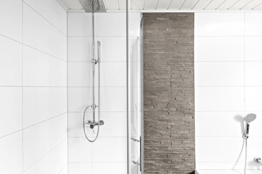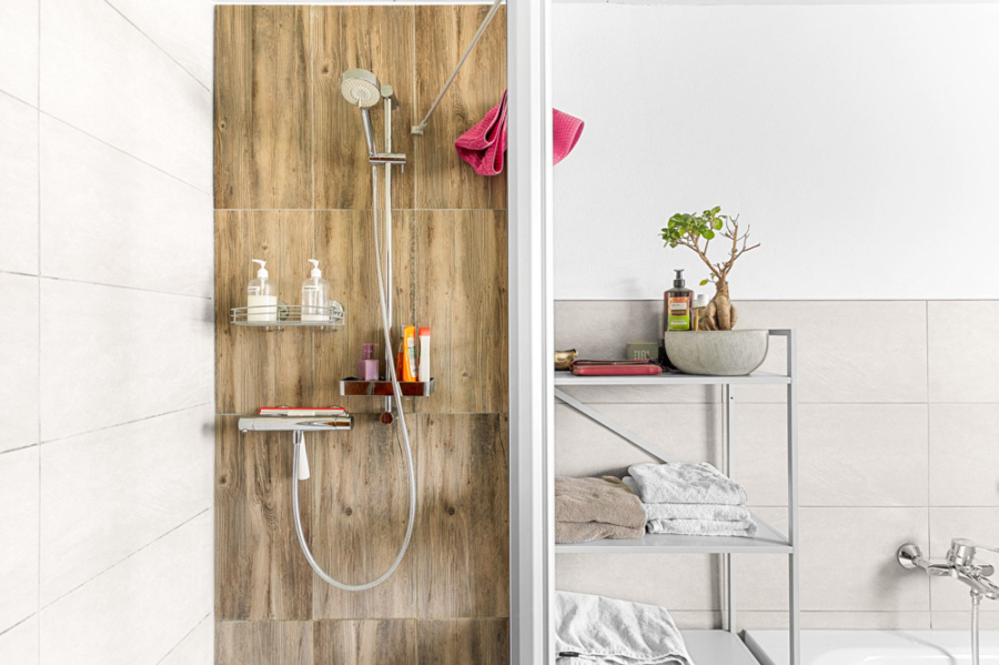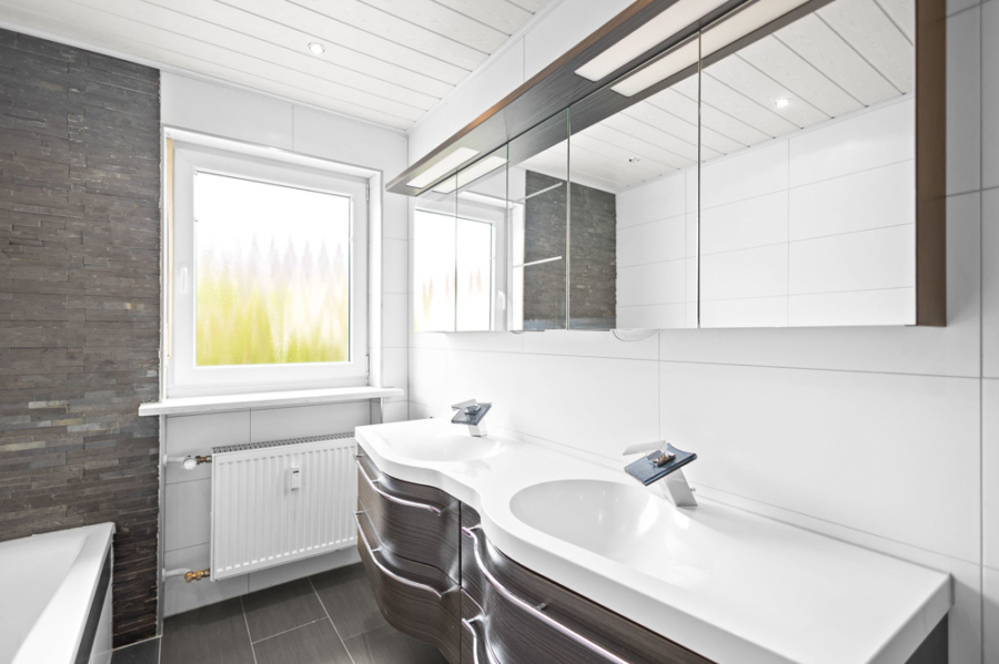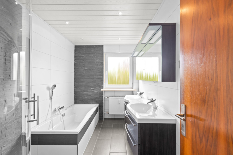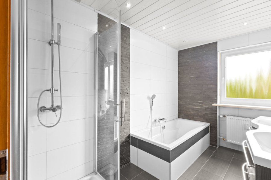 Das Badezimmer im Obergeschoss wurde ebenfalls modern ausgestattet und bietet sowohl eine komfortable Badewanne als auch eine separate Dusche und ein stilvolles Waschbecken – ein Ort zum Wohlfühlen und Entspannen. Ein separates WC komplettiert das Raumangebot dieser Etage.