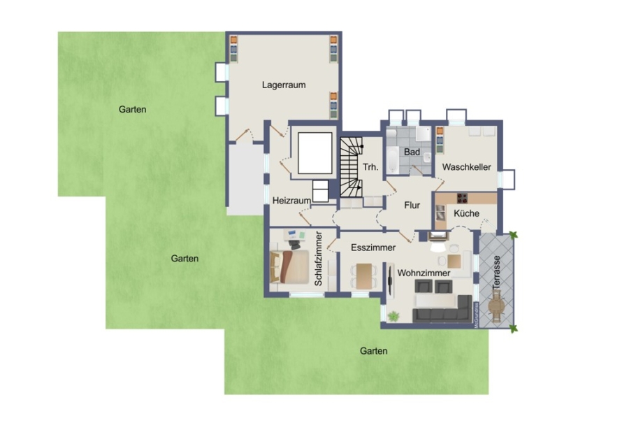 Doch damit nicht genug, im "Keller", welcher durch die Hanglage hauptsächlich Souterrain ist, finden Sie eine zusätzliche Einliegerwohnung vor. Auch hier dürfen Sie sich über einen Schwedenofen freuen! Neben einer Küche und einem großzügigen Wohnzimmer, finden Sie hier eine Essecke sowie ein Schlafzimmer vor. Von der Küche und vom Wohnzimmer aus gelangen Sie auf Ihre eigene – nach Süden und Osten ausgerichtete – Terrasse. Ein Badezimmer samt Badewanne schließt diese Einliegerwohnung ab.