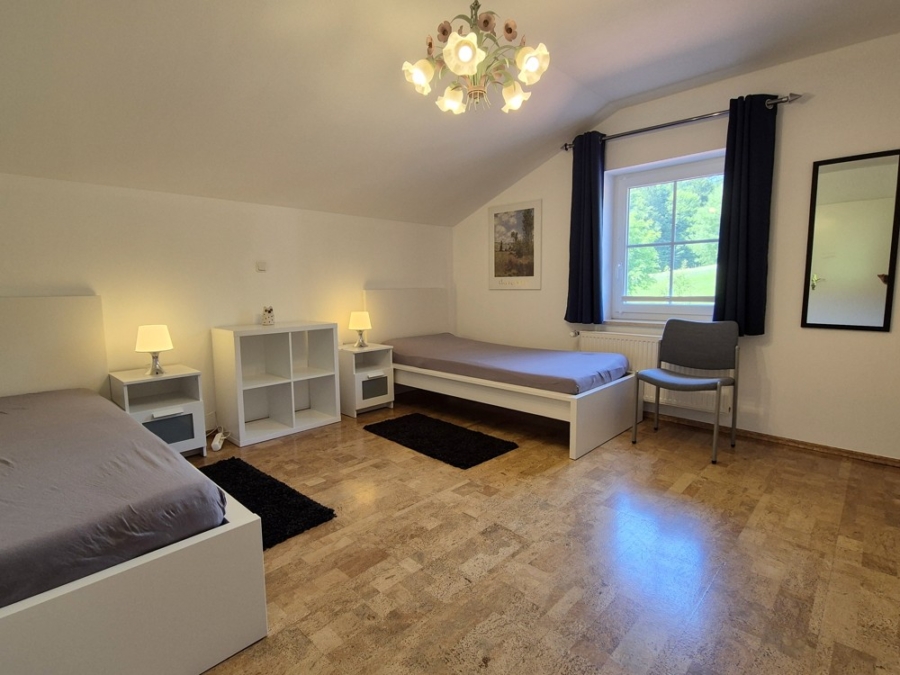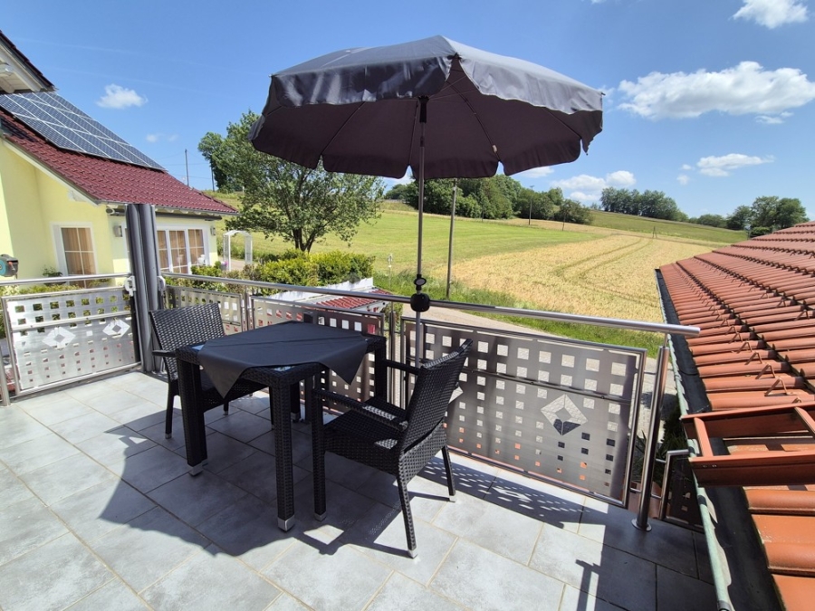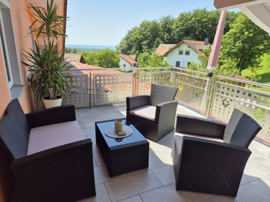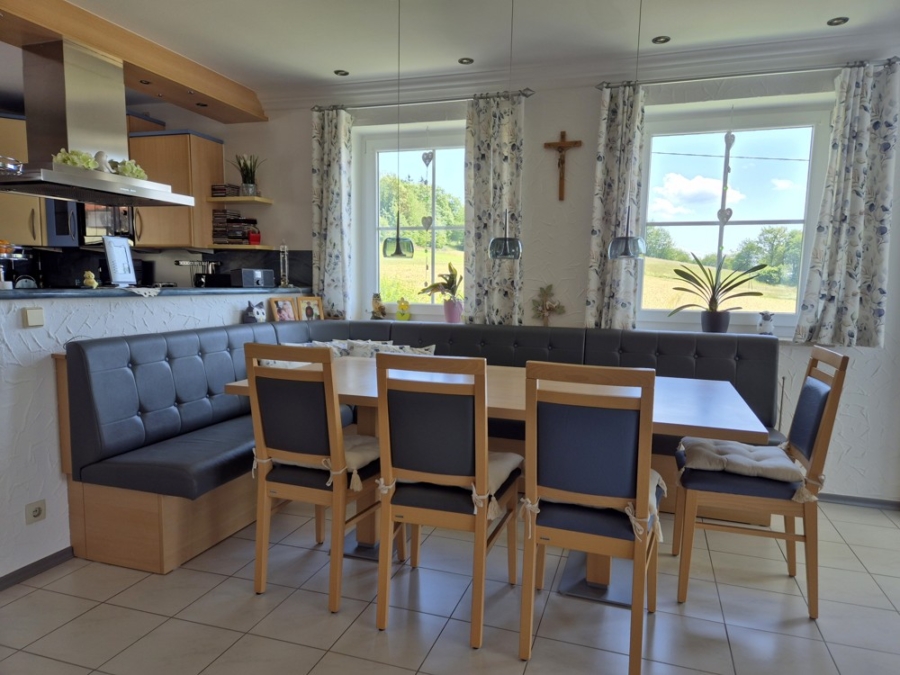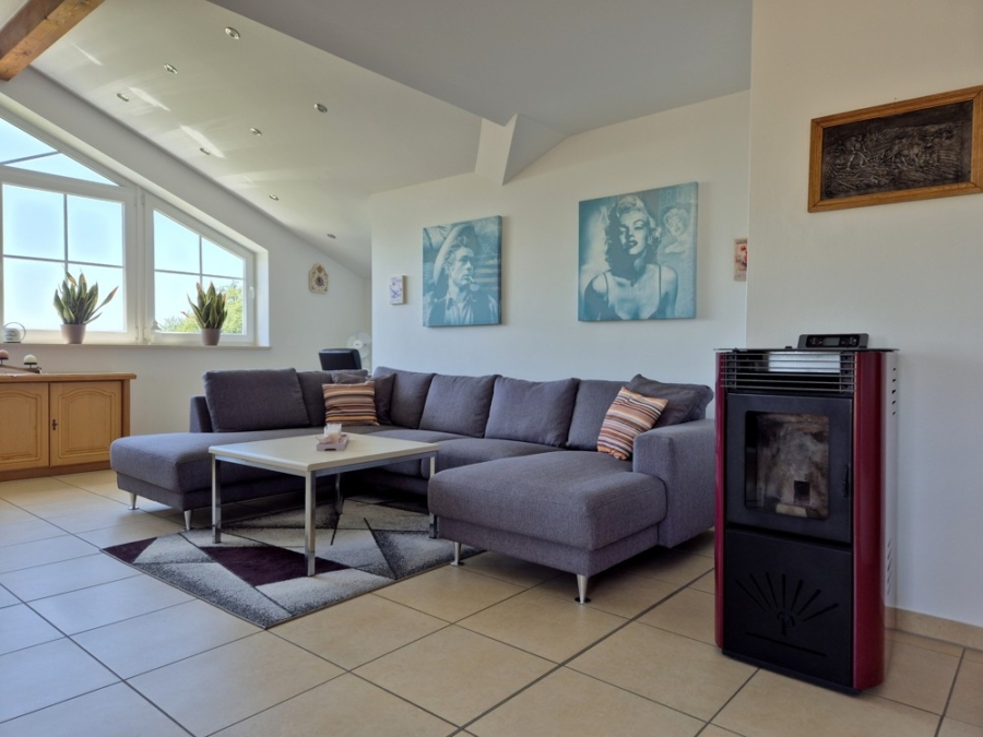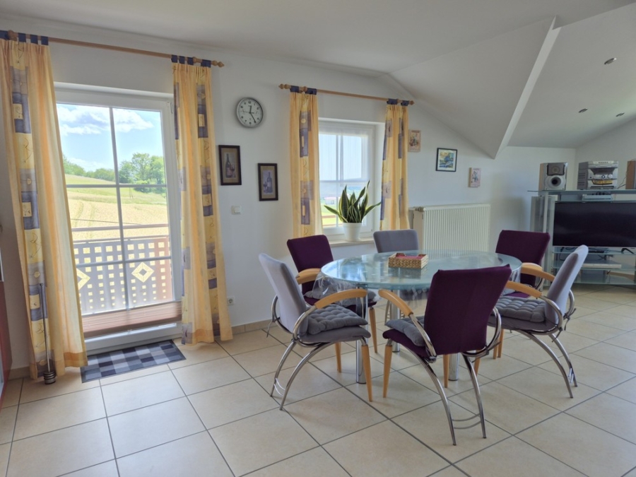 Ein echtes Kleinod ist die Wohnung im Dachgeschoss, welches erst 2008 umfassend um- und ausgebaut und zuletzt an Feriengäste vermietet wurde. Auch hier gibt es einen großzügigen Wohn-Essbereich, welcher mit einem Schwedenofen ausgestattet ist und einen wunderbaren Blick über den vorderen bayerischen Wald bereit hält. Die Küche ist ebenfalls großzügig und offen gestaltet, eine Speisekammer sorgt auch hier für den nötigen Stauraum. Ein kleiner Ost-Balkon lädt zu einem Kaffee am Morgen ein. Zurück im Flur finden Sie ein Gäste-WC vor, daran schließen sich gegenüber zwei Schlafzimmer an. Daneben befindet sich ein Tageslichtbad, welches mit einer großen Eckbadewanne sowie einer Dusche und einem Waschmaschinenanschluss ausgestattet ist. Geradewegs geht es in das Highlight dieser Dachgeschosswohnung, das mit Sichtbalken und Schwedenofen ausgestattete Schlafzimmer samt zwei Dachterrassen, eine nach Osten, eine nach Westen ausgerichtet. Somit können Sie zu jeder Tageszeit Sonne bzw. Schatten genießen – la dolce vita!