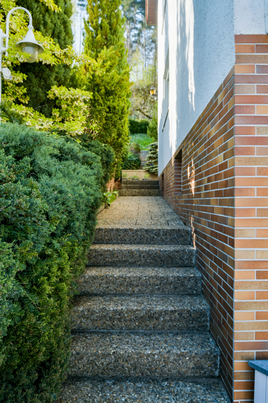 Über den weitläufigen idyllischen Garten gelangen Sie zum Haupteingang des Hauses.
