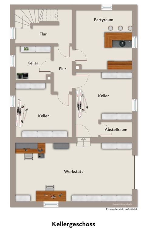 Der Keller des Hauses ist sowohl über das Erdgeschoss als auch über die großzügige Werkstatt zu betreten. Durch die ca. 70 m² Nutzfläche erwartet Sie hier, verteilt auf vier Kellerräume, von welchen einer als Partyraum genutzt wurde, ausreichend Abstellfläche.