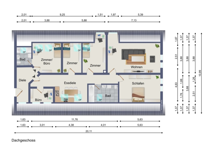 Die Wohnfläche beträgt ca. 112,18 m², aufgrund der Dachschrägen ist die Grundfläche aber deutlich größer, nämlich ca. 147 m².