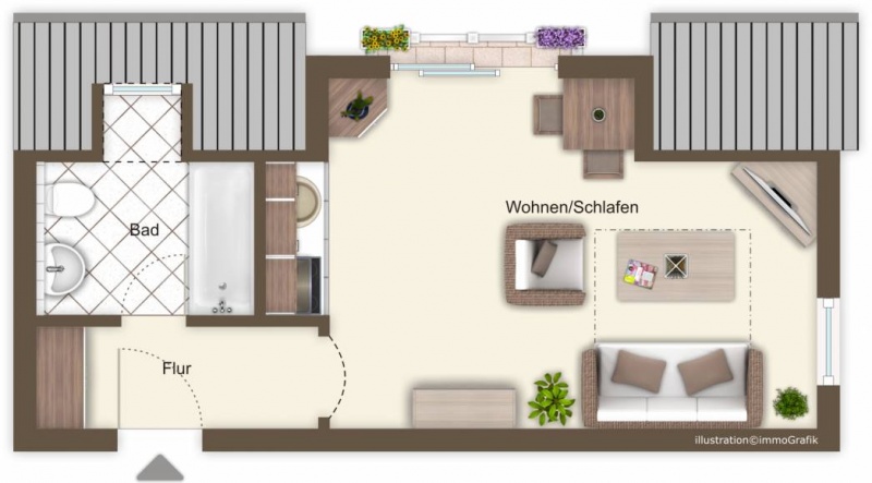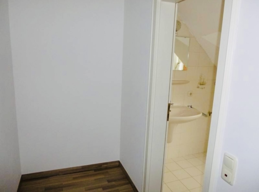 Den geräumigen Eingangsbereich mit Garderobe betretend, gelangen Sie geradeaus in Ihr Badezimmer.