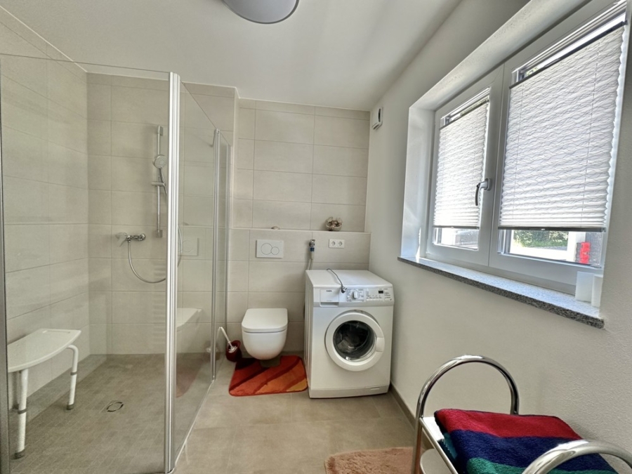 • Badezimmer: Modernes Bad mit Waschmaschinenanschluss und begehbarer Dusche.