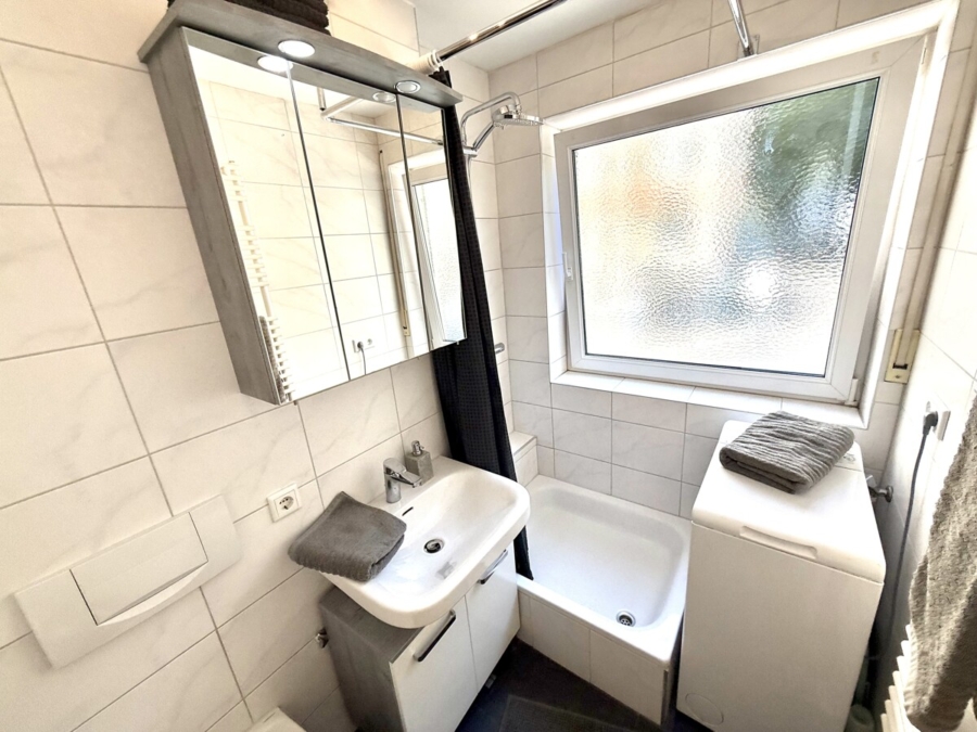 Verfügt seit wenigen Jahren über ein saniertes Bad – bodenseits dunkelgrau wie wandseits weiß gefliest – mit Dusche, Handtuchheizköper und Anschlüssen für Ihre Waschmaschine ausgestattet.