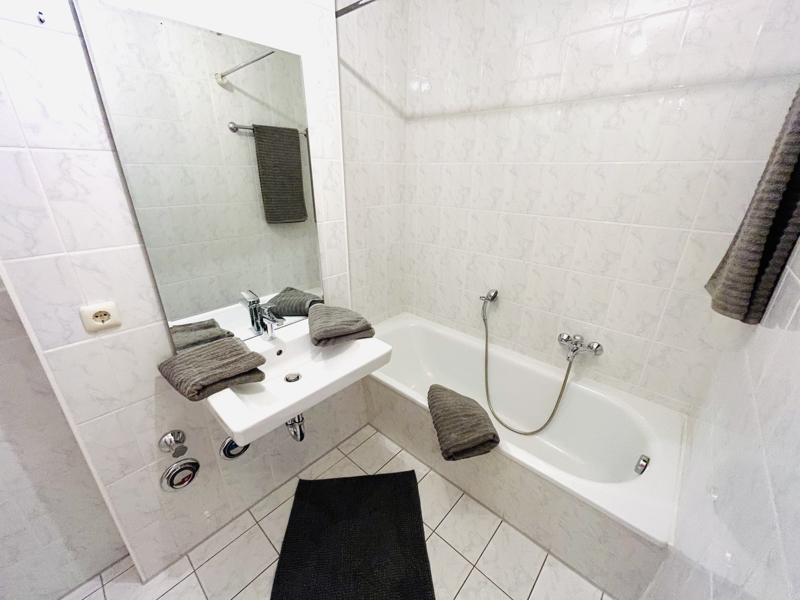 Weitergehend, gelangen Sie – eine Abstellkammer passierend – wiederum linker Hand in Ihr eines Badezimmer mit Waschtisch, Wanne und Waschmaschinenanschlüssen. Abermalig rechter Hand in Ihr anderes Badezimmer mit Waschtisch, Dusche und WC.