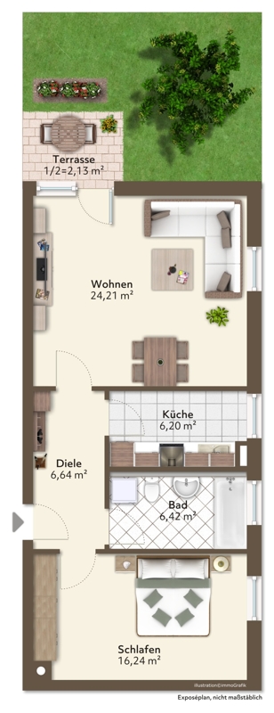 Linker Hand Ihr Sie über Ihre Terrasse in Ihren kleinen Garten führendes Wohnzimmer mit allein rund 25 m² Wohnfläche – das sich Ihnen dann nach Süden und Westen ausgerichtet zeigt.