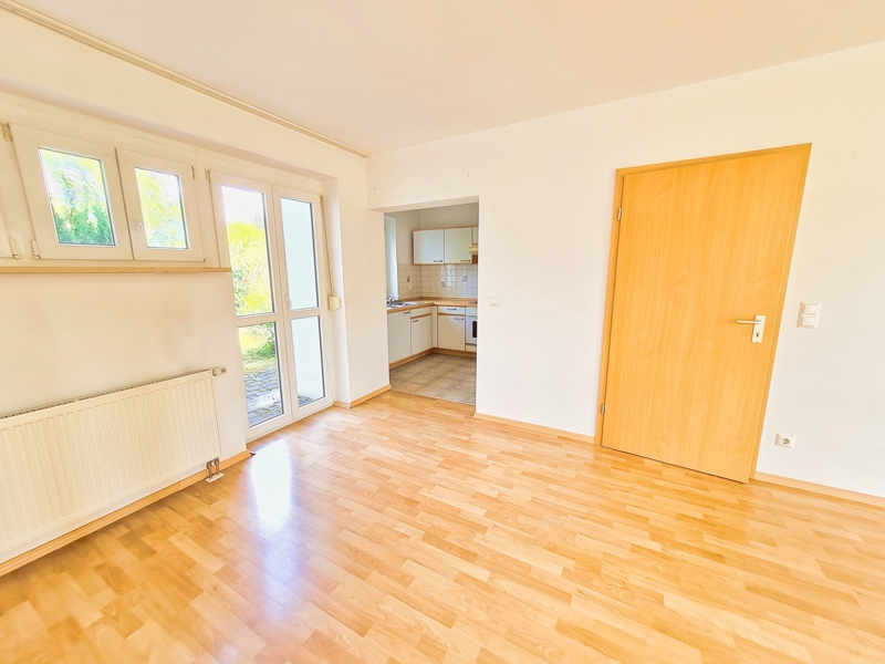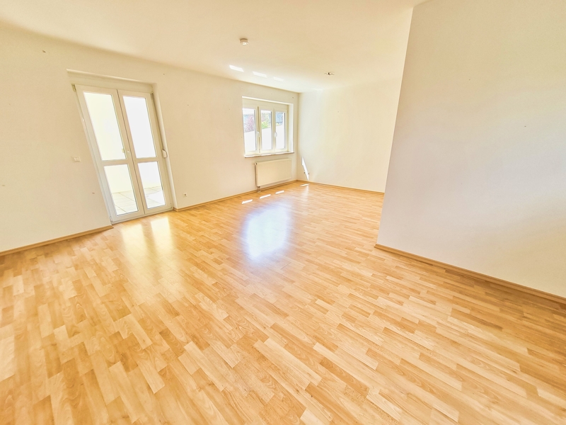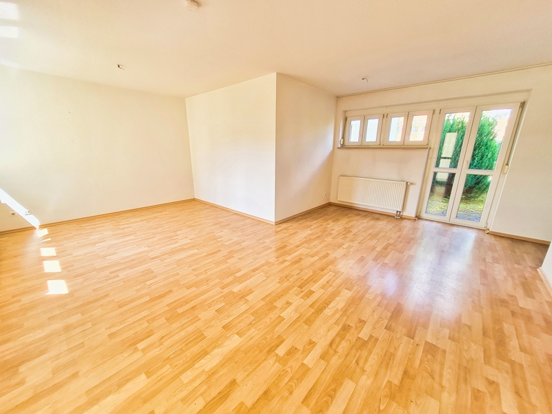 Ihr Wohn- und Essbereich, der Sie einerseits auf Ihre Loggia mit kleinerem Gärtchen wie andererseits auf Ihre Terrasse mit großem Garten führt.