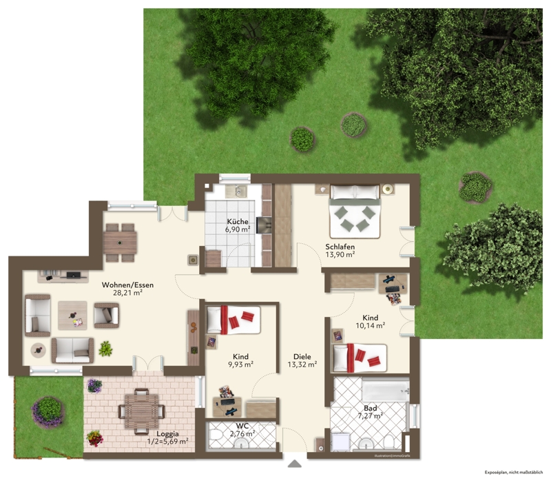Insbesondere aber verfügt Ihre Wohnung sowohl über eine Loggia mit kleinem Gärtchen – nach Süd-Westen orientiert.