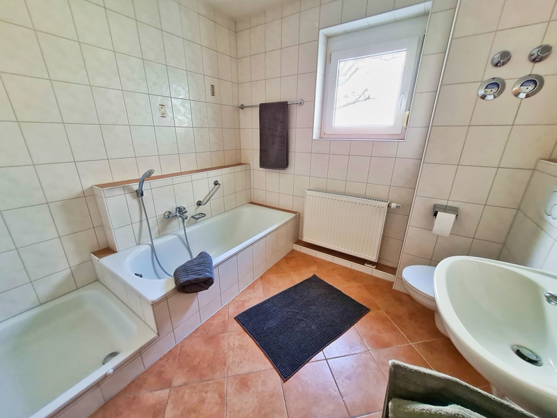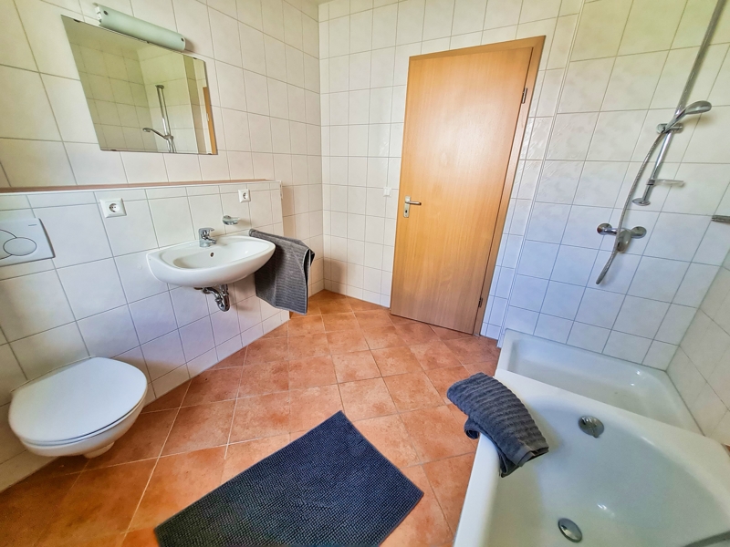 Ihr mit einem Fenster versehenes Badezimmer präsentiert sich Ihnen bodenseits terracottafarben und raumhoch weiß gefliest, bietet Ihnen Wanne und Dusche sowie die Anschlüsse für Ihre Waschmaschine.