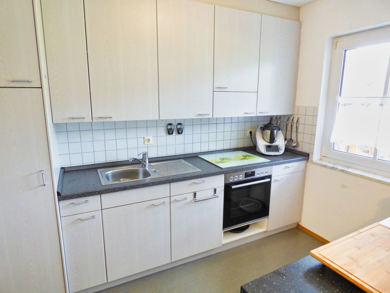 Eine (Einbau)küche(nzeile) in grauen Fronten sowie mit Backofen, Cerankochfeld und Kühlschrank ausgestattet, ist auch schon vorhanden.