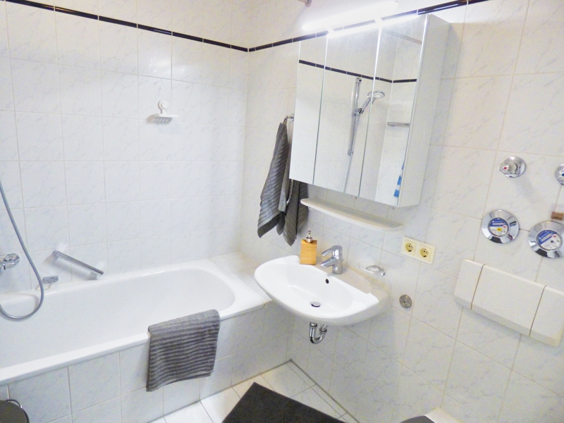 Ihr Badezimmer – bodenseits wie raumhoch weiß gefliest – zeigt sich Ihnen mit einer Wanne versehen.