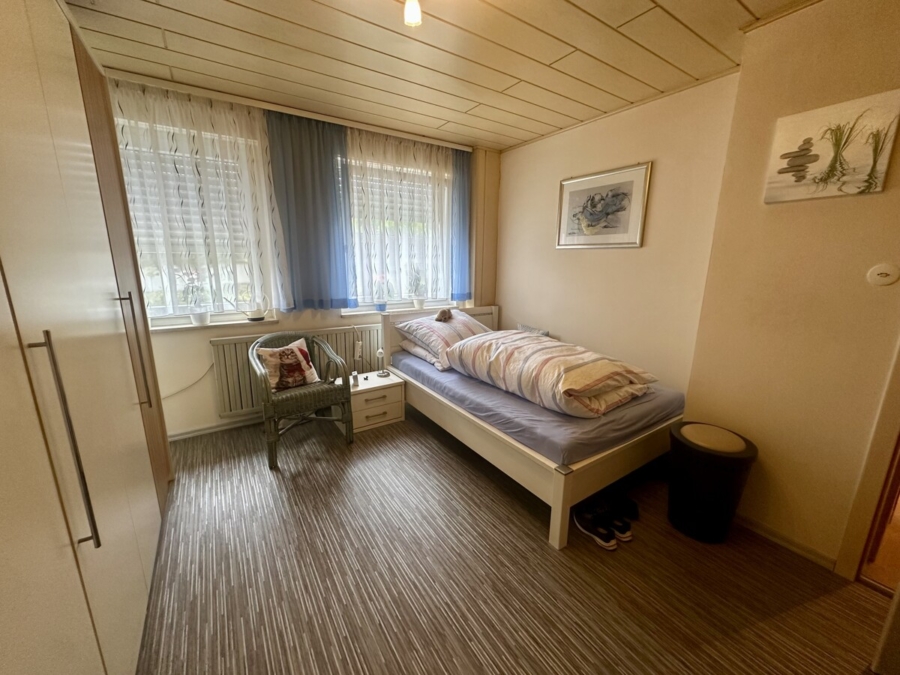 Das Schlafzimmer ist großzügig geschnitten und bietet ausreichend Platz für ein großes Bett und einen geräumigen Kleiderschrank. Das Tageslichtbad wurde 1996 vollständig erneuert und verfügt über eine Dusche, ein Waschbecken, ein WC sowie einen Anschluss für die Waschmaschine.