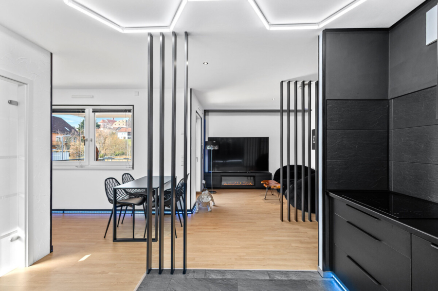 Ein Highlight ist der Wohn-/Essbereich. Auf über 40 m² durchdesignter Fläche können Sie sich frei entfalten. Die schwarzen Raumteiler passen gut zur Küche und bilden schöne Raumzonen. Der Balkon mit Blick zur Kirche lädt zum Verweilen ein.