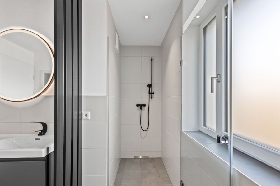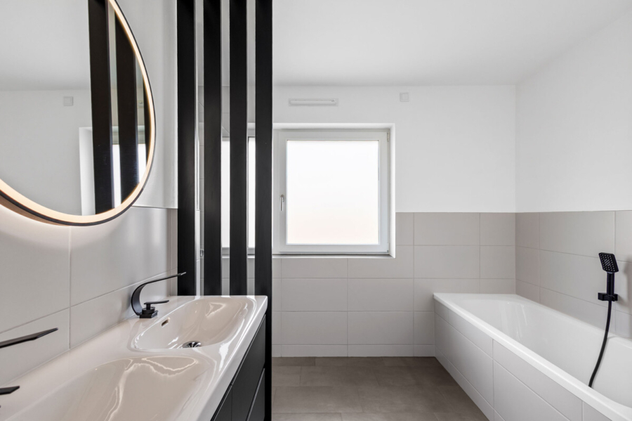 Über eine Diele betreten Sie die Wohnung. Rechtsseitig befindet sich ein Arbeits- oder Kinderzimmer, linker Hand wurde ein Einbauschrank geschaffen. Das Badezimmer ist modern, mit Wanne, Dusche und Waschmaschinenplatz ausgestattet. Die schwarzen Armaturen runden das stimmige Gesamtbild ab.