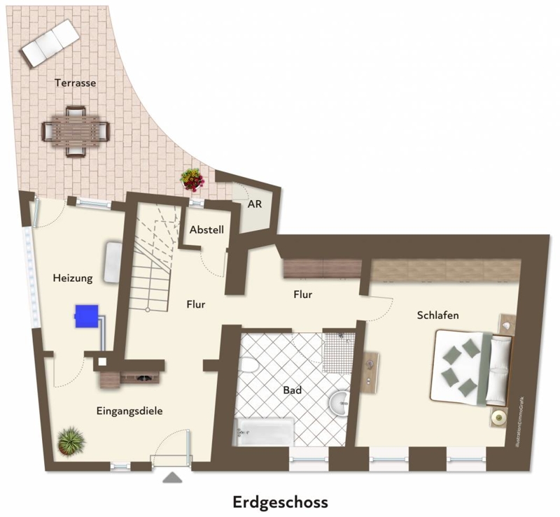 Über die Eingangsdiele Ihres Erdgeschosses in den Flur eintretend, erreichen Sie rechter Hand Ihr Badezimmer – mit Wanne und Dusche – sowie Ihr Schlafzimmer.