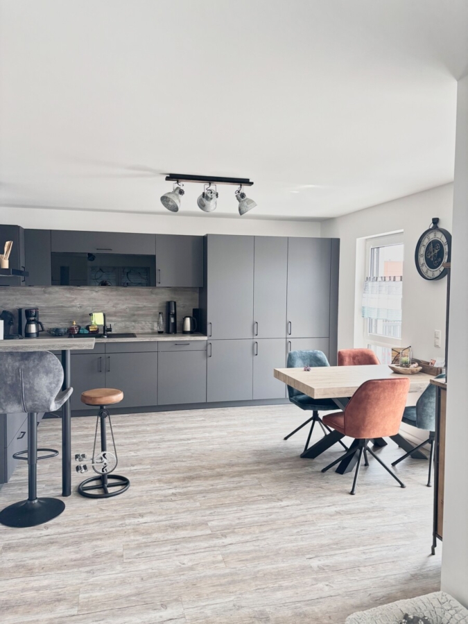 Tauche in die besondere Atmosphäre der modernen Vollmöblierung ein und genieße die stilvolle, hippe Einbauküche, die perfekt für kulinarische Abenteuer vorbereitet ist.