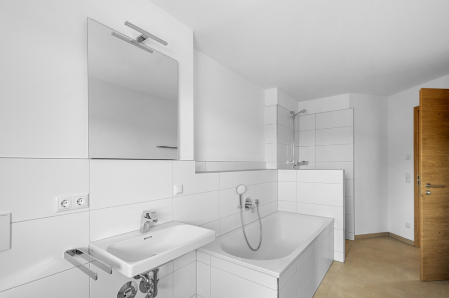 Modern und funktional gestaltet, verfügt das Badezimmer über eine Badewanne, eine Dusche, ein WC und ein Waschbecken. Hier starten Sie gut in den Tag und entspannen am Abend.