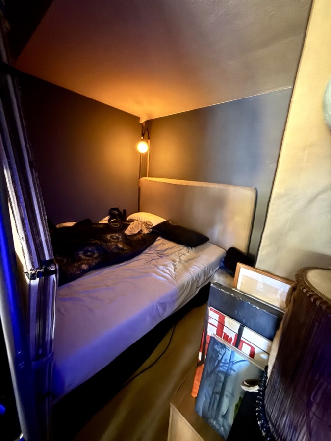 Das Badezimmer sowie die Küche sind jeweils räumlich getrennt und befinden sich nicht im Wohn- oder Schlafbereich. Das Badezimmer verfügt über eine Badewanne, einen Waschtisch sowie ein WC. Die Küche ist separat angeordnet und mit einer funktionalen Einbauküche ausgestattet, die Stauraum und Arbeitsfläche bietet.