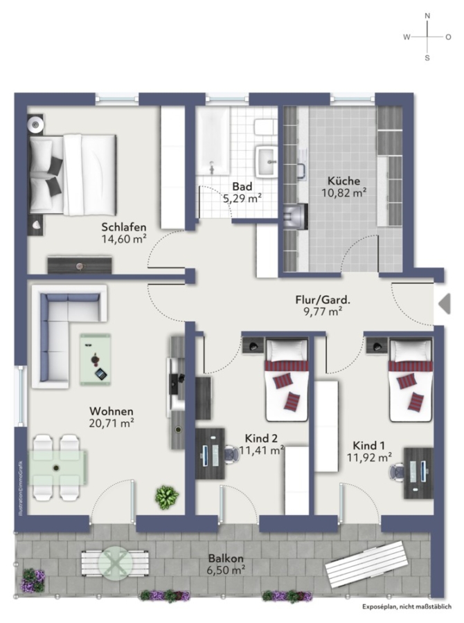 Die Wohnung ist aufgeteilt in eine geräumige Diele, ein Wohnzimmer sowie zwei Kinderzimmer, die alle Zugang zum Süd-West-Balkon besitzen. Rechter Hand des Flurs befindet sich das Elternschlafzimmer, die Küche inklusive neuer Einbauküche, sowie ein Badezimmer mit Badewanne und WC.