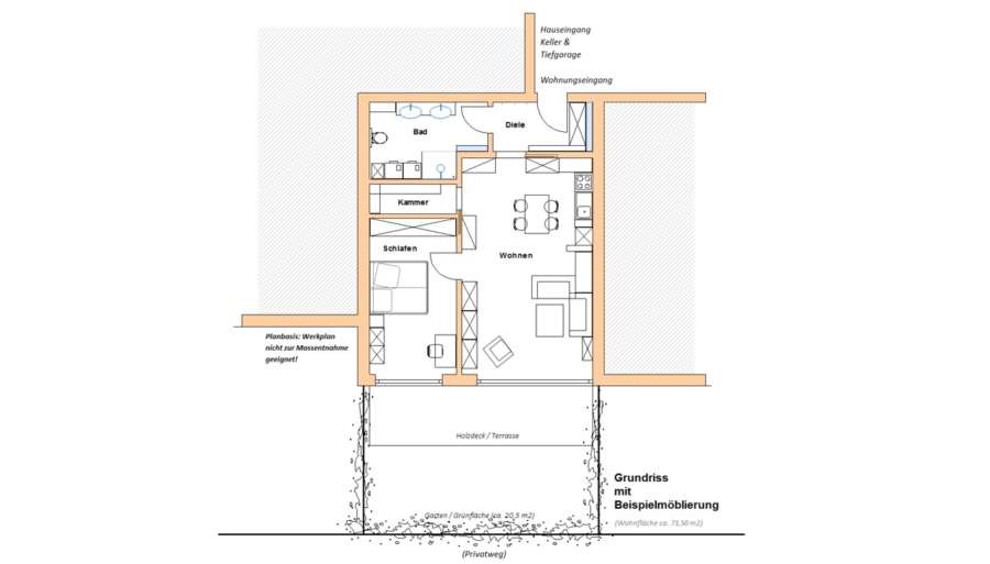 Die Wohnung verfügt über ein geräumiges Schlafzimmer und einen Hauptwohnraum mit integrierter Küche, ein stilvolles Badezimmer, Diele und Abstellraum vervollständigen das für Singles, Paare oder kleine Familien ausreichende Raumangebot. Wohnraum und Schlafzimmer bieten eine bodentiefe Verglasung und direkten Zugang zur breiten Terrasse (Holzedeck) und dem angrenzenden kleinen Garten (eingezäunt).