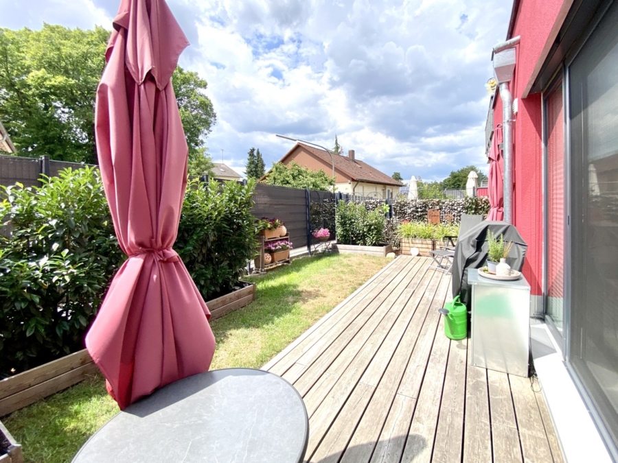 - große, geschützte Terrasse (Holzdeck) und kleiner eingezäunter Garten