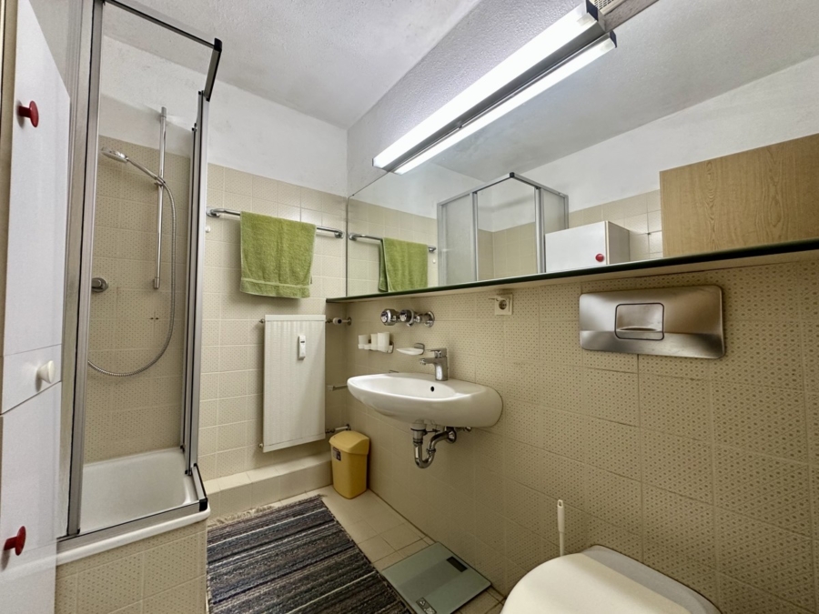 Das innenliegende Badezimmer verfügt über eine Lüftung, ist gefliest und mit Dusche, Waschbecken, WC sowie einem Waschmaschinenanschluss ausgestattet.