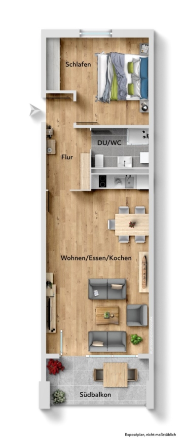 Der geräumige Wohnbereich vereint Wohnen, Essen und Kochen in einem offenen Konzept. Die Einbauküche bleibt im Objekt und bietet alles für den täglichen Bedarf. Eine breite Fensterfront über die gesamte Raumseite sorgt für viel Tageslicht und gewährt Zugang zum großzügigen Südbalkon – perfekt, um Sonne und Panorama zu genießen.