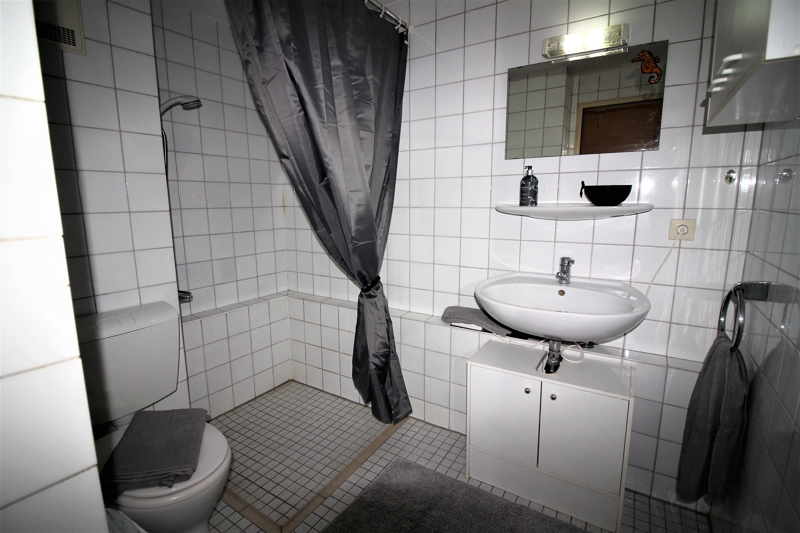 In dem weiß gefliesten Badezimmer mit Dusche und Toilette wäre auch ein Waschmaschinenanschluss.
