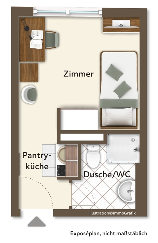 Die Wohnung betritt man durch einen kleinen Gang, in dem eine Pantry-Küche eingebaut ist. Rechts geht man in ein großzügiges Bad mit Dusche.