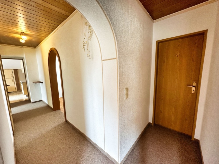 Ihre Wohnung im ersten Stock betretend führt ein Flur Sie zu Ihren Wohnbereichen. Linker Hand gelangen Sie in Ihre Küche mit Platz für Ihre Essecke und von dieser rechter Hand in Ihr erstes (Schlaf) – Zimmer. Auf der linken Seite befindet sich auch Ihr Badezimmer mit Wanne und Fenster.