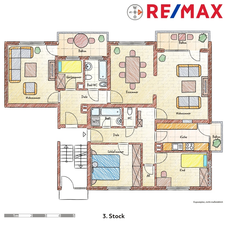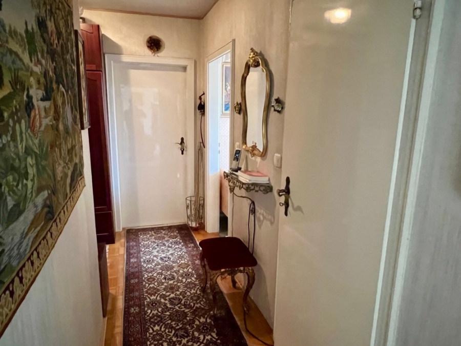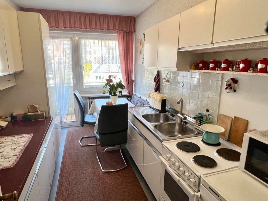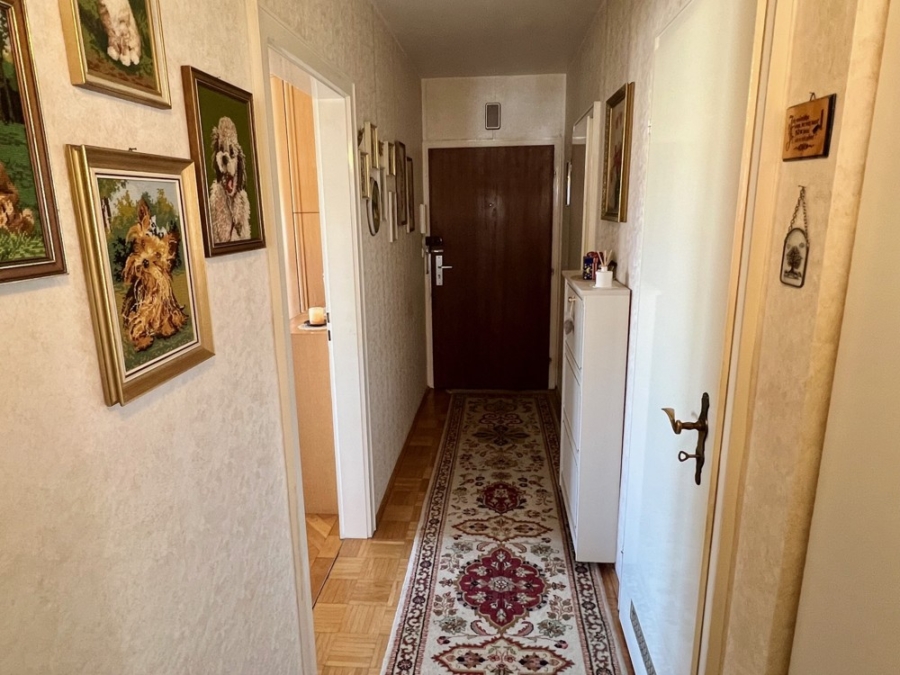 Die fünf Zimmer Wohnung ist aufgeteilt in 4 Schlafzimmer, ein Wohn/Esszimmer mit Zugang zum Balkon mit schönem Weitblick. ein Abstellraum, ein saniertes großes Badezimmer aus dem Jahr 2005 mit Badewanne und Dusche sowie ein Waschmaschinenanschluss. Eine separate Toilette und ein weiteres Badezimmer mit Badewanne.