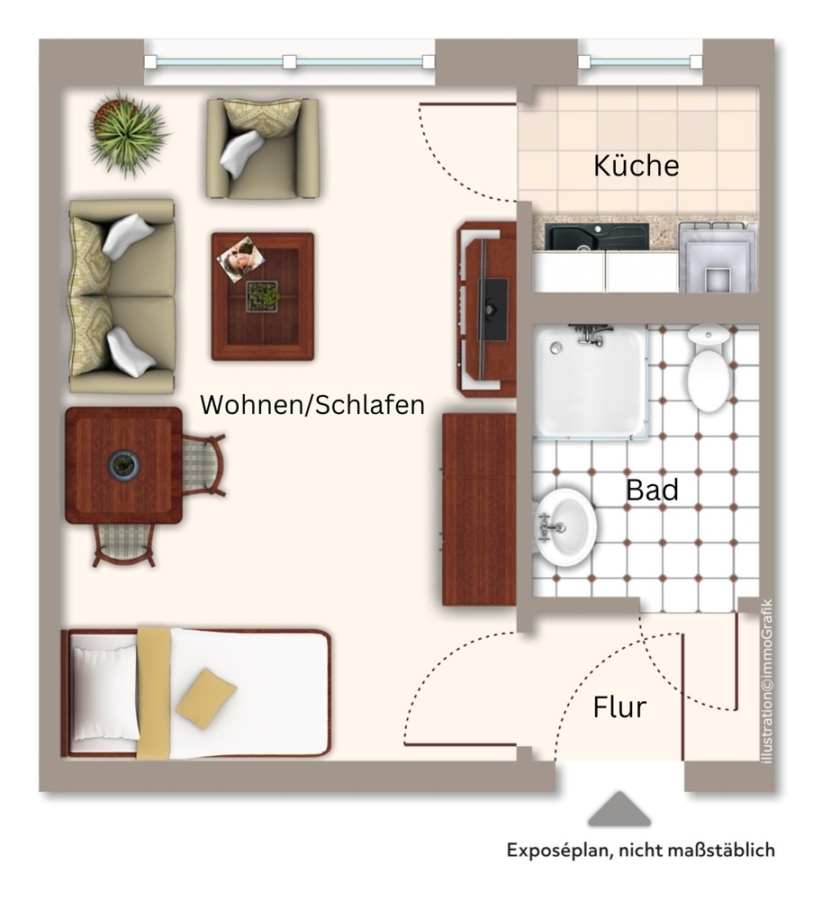 In den Flur eintretend, finden Sie geradewegs das Badezimmer der Wohnung vor. Zur linken Seite öffnet sich der helle Wohn- und Schlafbereich.