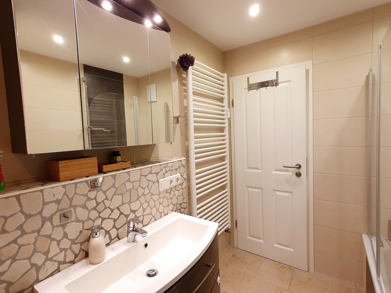 Zurück im Flur geht es geradewegs in das Schlafzimmer, welches mit liebevoll gestalteten Nischen und Sichtmauerwerk aufwartet. Gegenüber befindet sich das moderne Badezimmer, in dem nicht nur eine Badewanne, sondern auch eine Waschmaschine Platz finden.