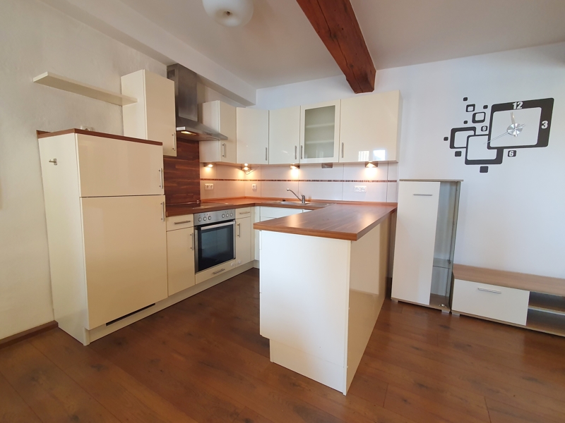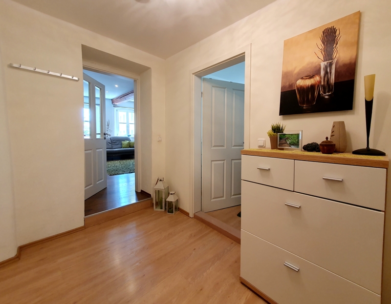 Angekommen im ersten Stock befinden Sie sich zunächst in einem praktischen Flur. Linker Hand gelangen Sie in das großzügige Wohn-Ess-Zimmer samt offener Küche. Dieses mehr als 30 Quadratmeter große Herzstück der Wohnung besicht durch Sichtbalken sowie zahlreichen Fenstern hin zur Obermünsterstraße. Von hier aus schließt sich ein weiteres Zimmer an, welches als Kinderzimmer oder Büro genutzt werden kann.