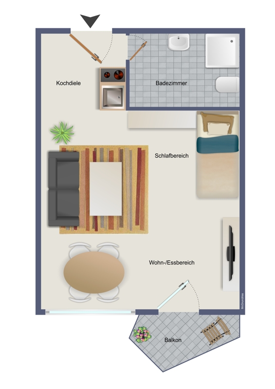 - Wohn-/Schlafbereich: Bietet ausreichend Platz für Bett, Sitzecke und Stauraum.