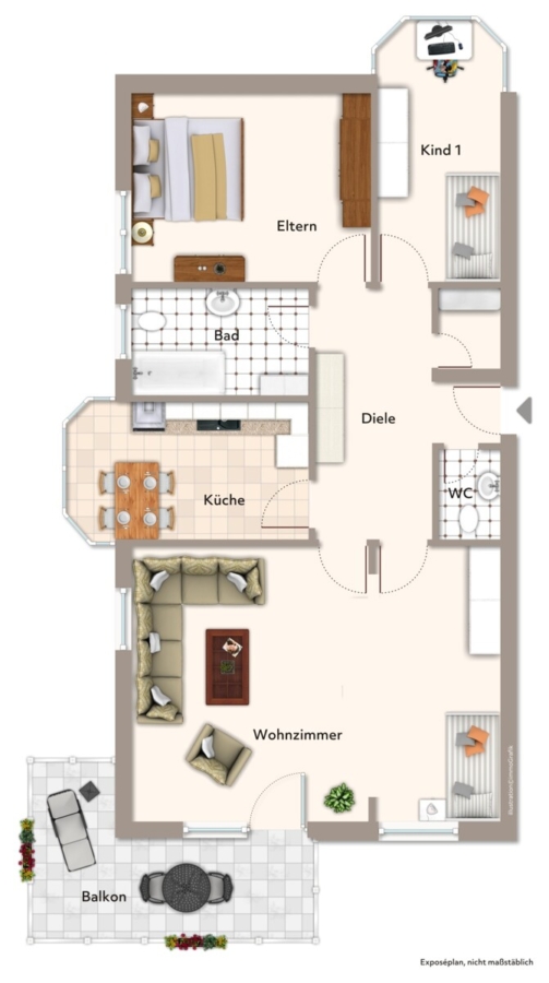 Besondere Akzente setzen die Erker in der Küche und im Kinderzimmer. Diese schaffen nicht nur zusätzlichen Raum, sondern verleihen der Wohnung auch eine charmante Note.