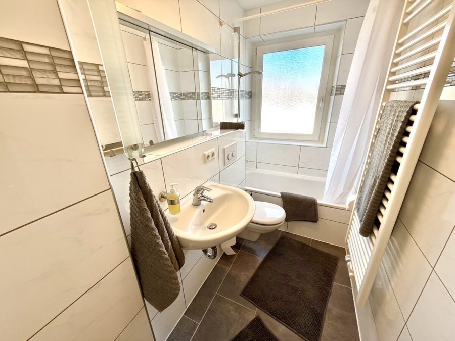 In der Diele Ihrer umfassend sanierten Wohnung stehend, erreichen Sie rechter Hand – nach Nord-Osten orientiert – zunächst Ihr Badezimmer, folgend Ihre Küche.