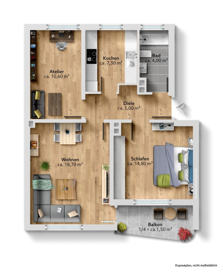 Linker Hand Ihrer Diele gelegen – nach Süd-Westen ausgerichtet – erschließen sich Ihnen entsprechend Ihr Schlafzimmer und Ihr Wohnzimmer – letzteres mit Zugang zu Ihrem Balkon.