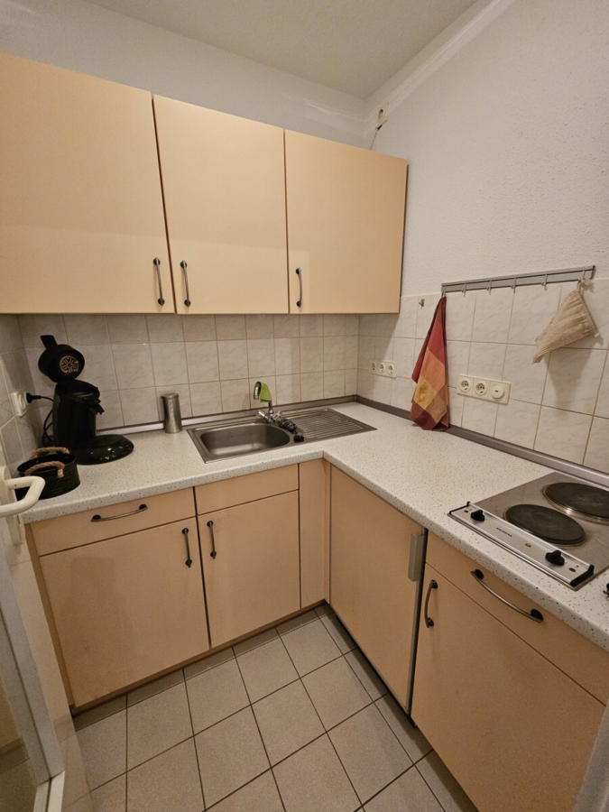 Kochbereich mit Einbauküche. Bad mit Dusche.