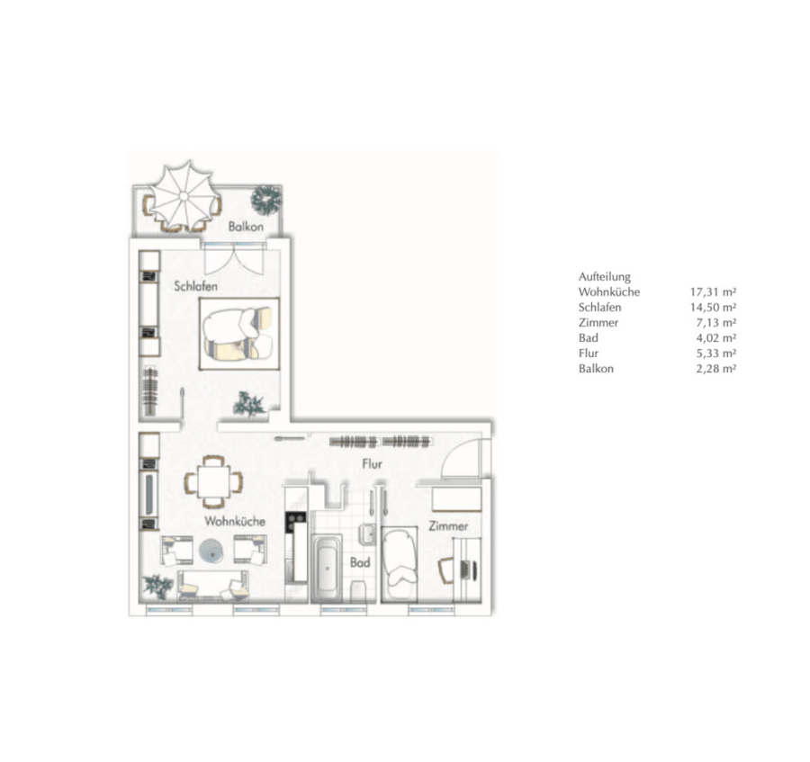 Mit einer Wohnfläche von ca. 50 m² verteilen sich Zimmer auf einer durchdachte Raumaufteilung.